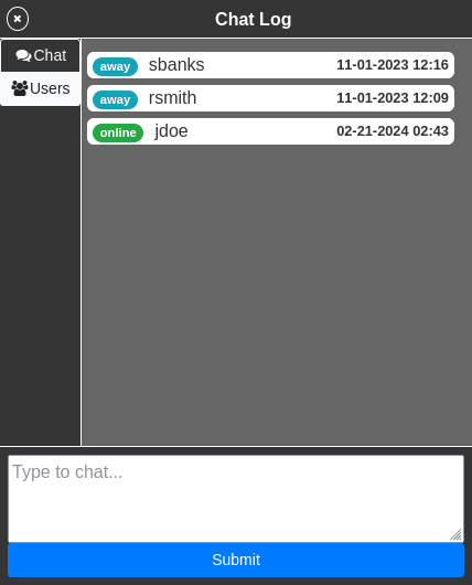 It has two tabs. Chat to view the Chat log and Users to see users and their statuses.