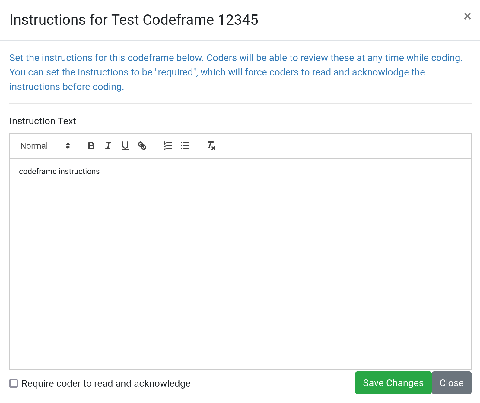 This dialog can be used to read/modify coding instructions that help coder be more consistent when coding this codeframe. The editor contains a minimal ability to format the instructions.