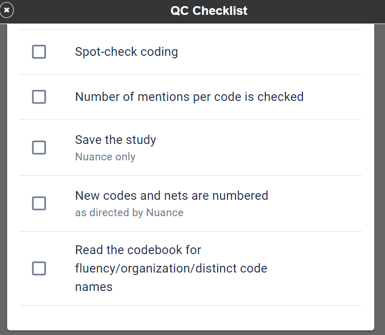The QC Checklist is a custom list of items that define necessary QC steps for Coders to sign off on.