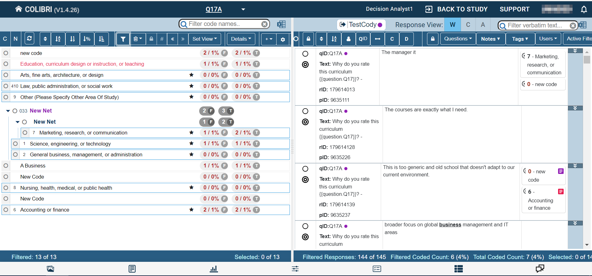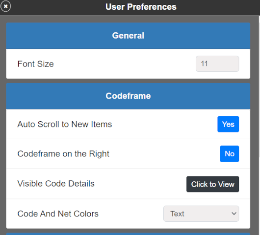 | Font Size | Adjust the size of the text in the Codeframe and Response panels |