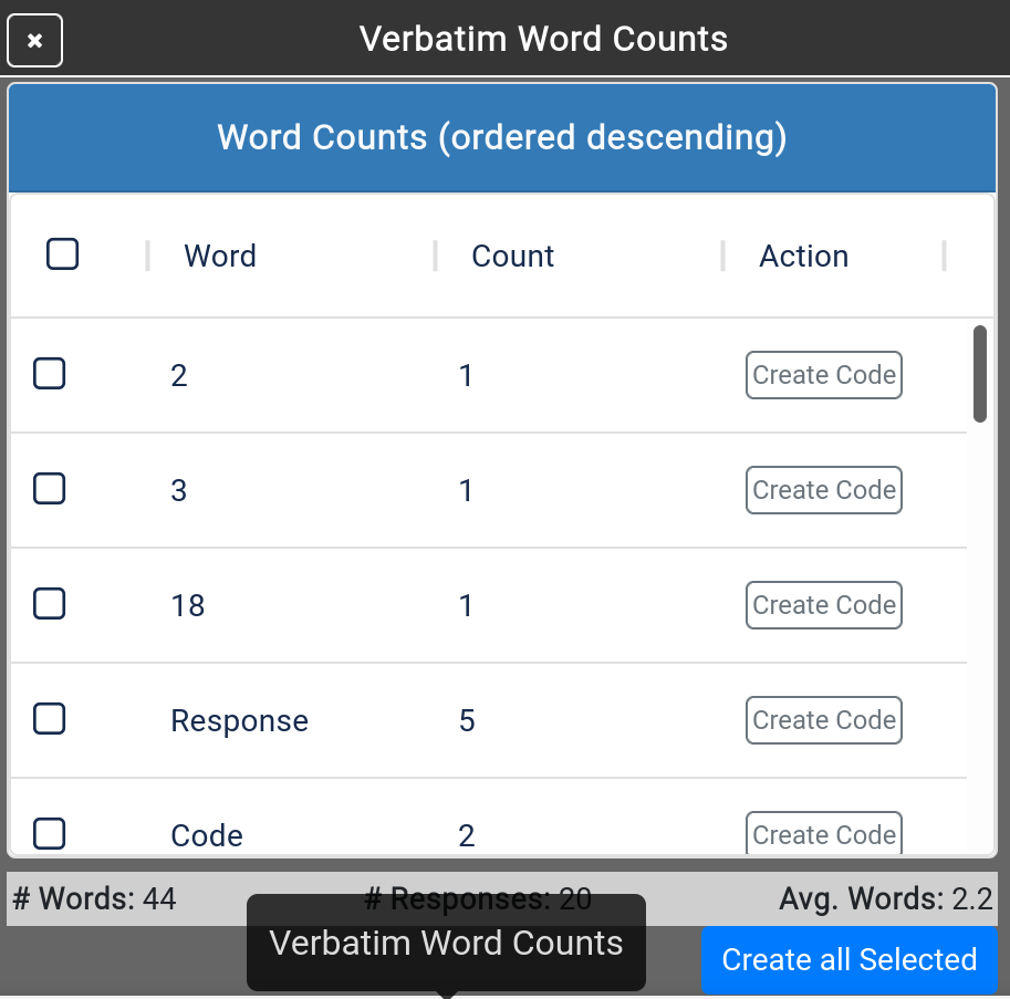 Displays a list of the most common words sorted by count in descending order. Click the Create Code button to create an individual code from a word or selected multiple and click on the "Create all Selected" to create multiple codes at once.