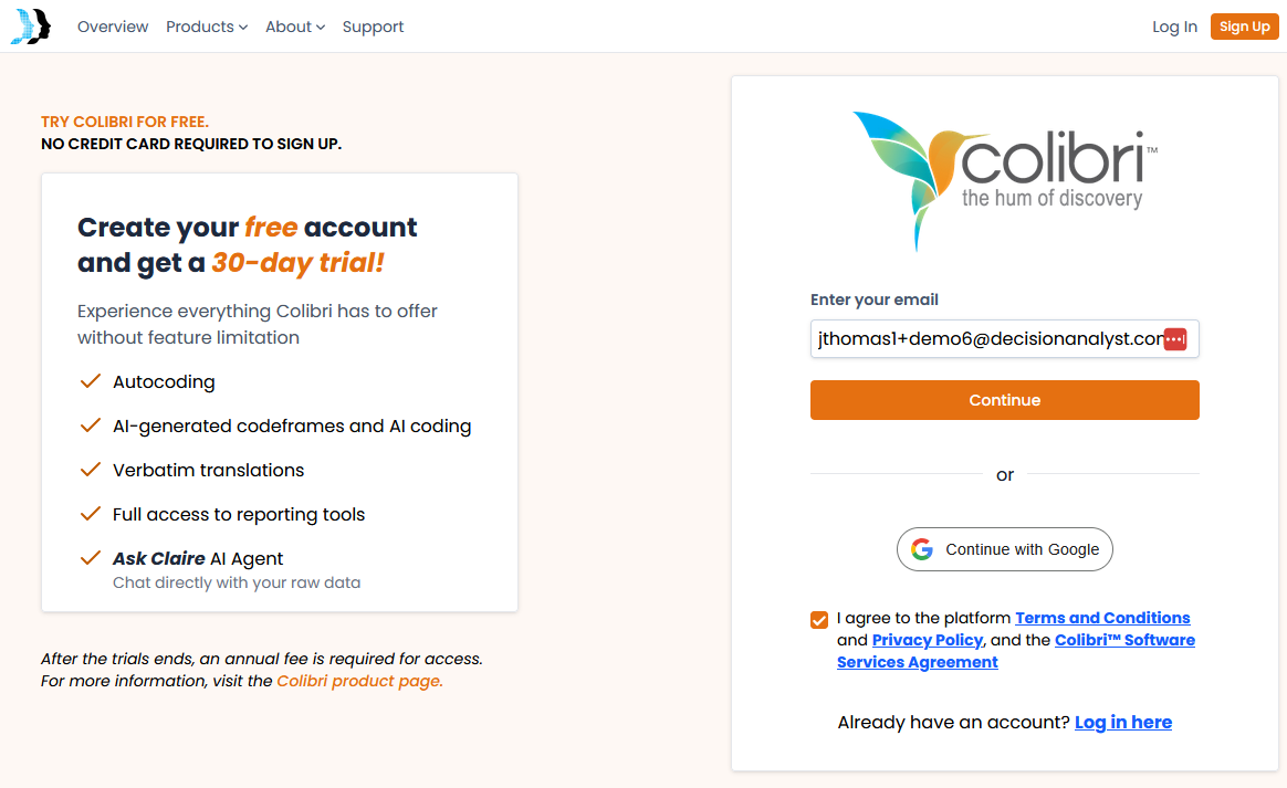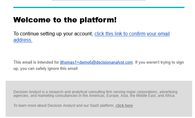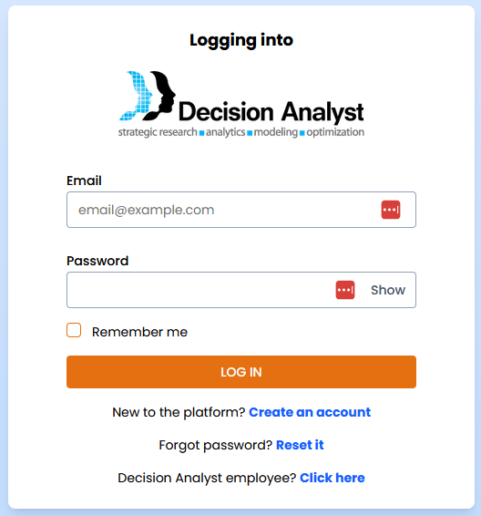 You're required to sign up for an account on the SaaS Platform to use Colibri. The sign up process is simple and can be completed in a few minutes. Go to the Decision Analyst SaaS platform at https://saas.decisionanalyst.com.