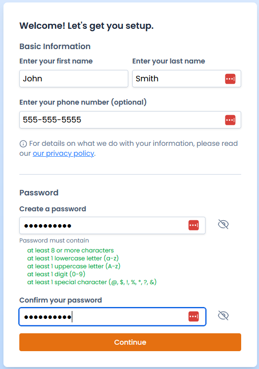 After entering your email, click on the "Continue" button. An email will be sent that will complete the initial setup step.